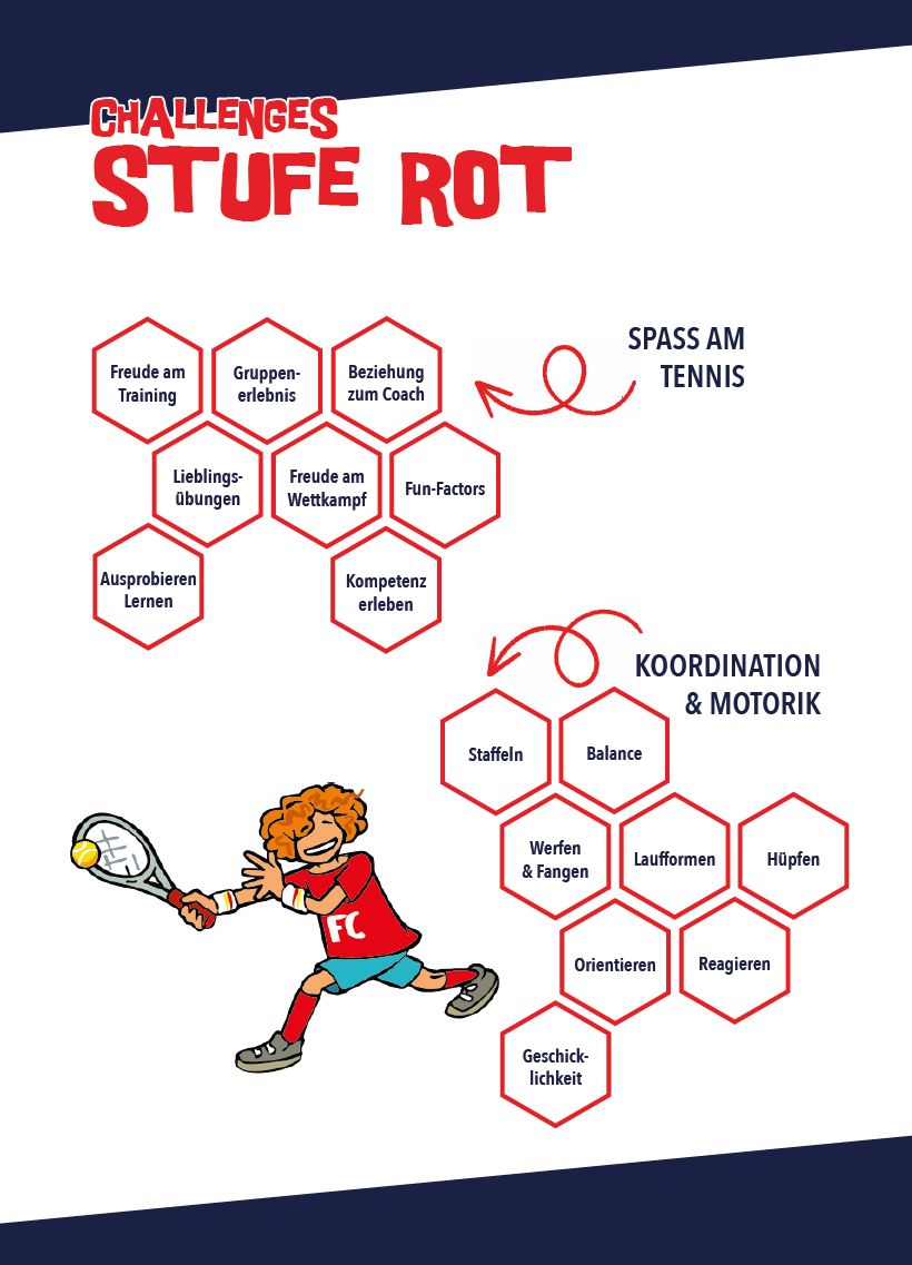 Die beiden Hefte begleiten die Kinder im Training durch die verschiedenen Challenges im Kindertenniskonzept. In jeder Stufe warten altersgerechte Challenges aus verschiedenen Kategorien, die im Training erarbeitet und vom Trainer gestempelt werden. So entsteht ein motivierendes Sammelsystem, das Lernfortschritte sichtbar macht und Kinder langfristig am Tennis hält.