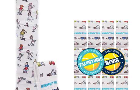 Kindgerechte Overgrips und farbige Seitendämpfer im DTB Kindertennis-Design sorgen für sicheren Halt, weniger Vibrationen und mehr Spaß am Spiel. Die Seitendämpfer sind passend zu den Stufen Blau, Rot, Orange und Grün gestaltet und die Overgrips mit den Kindertennis Teenis bedruckt.